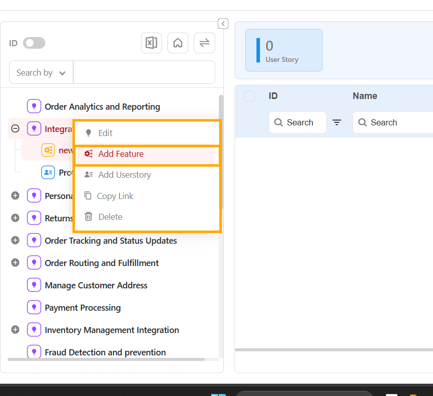 * **Add User Story** – Create and associate a new User Story directly under the selected Feature.