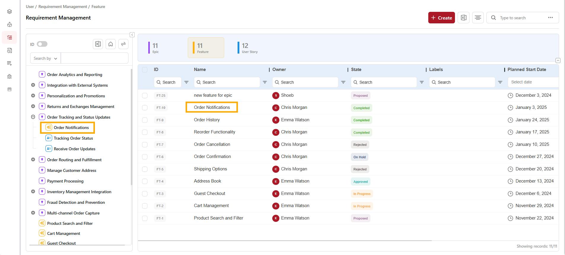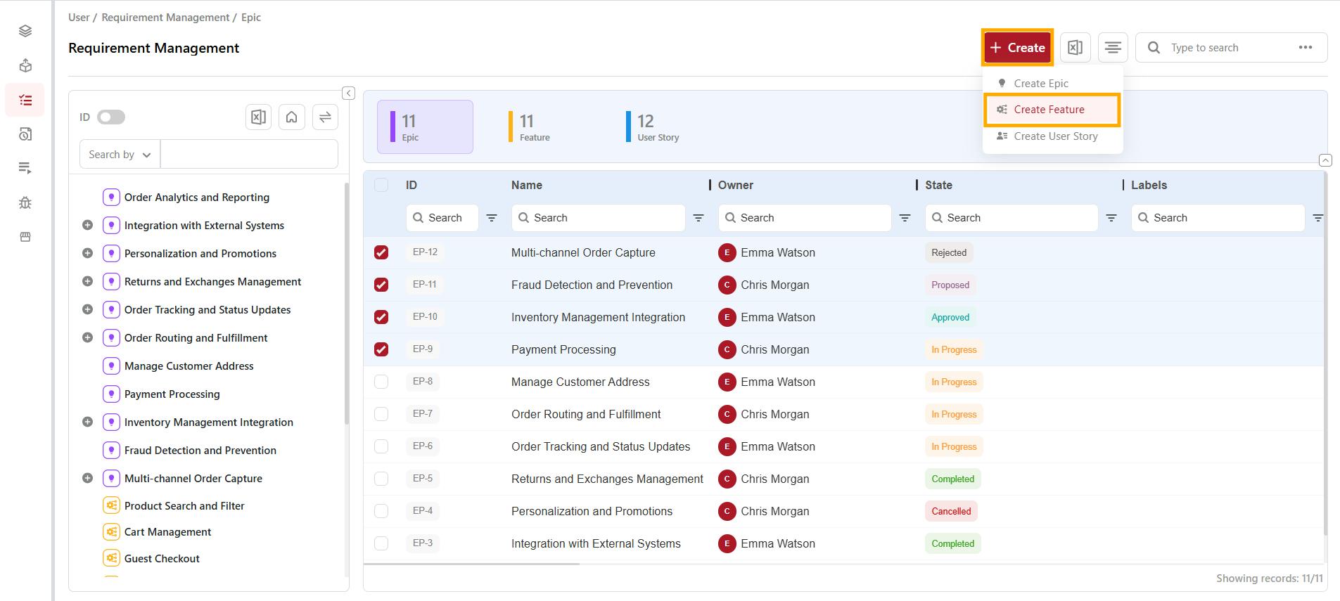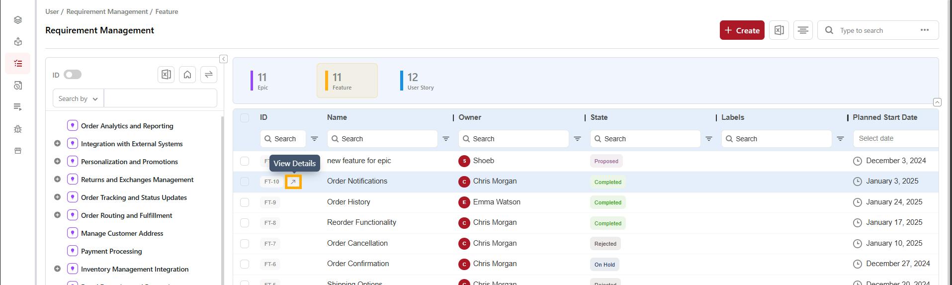The Feature will now appear under the selected Epic on the Requirement Management page and in the Tree Panel on the left.