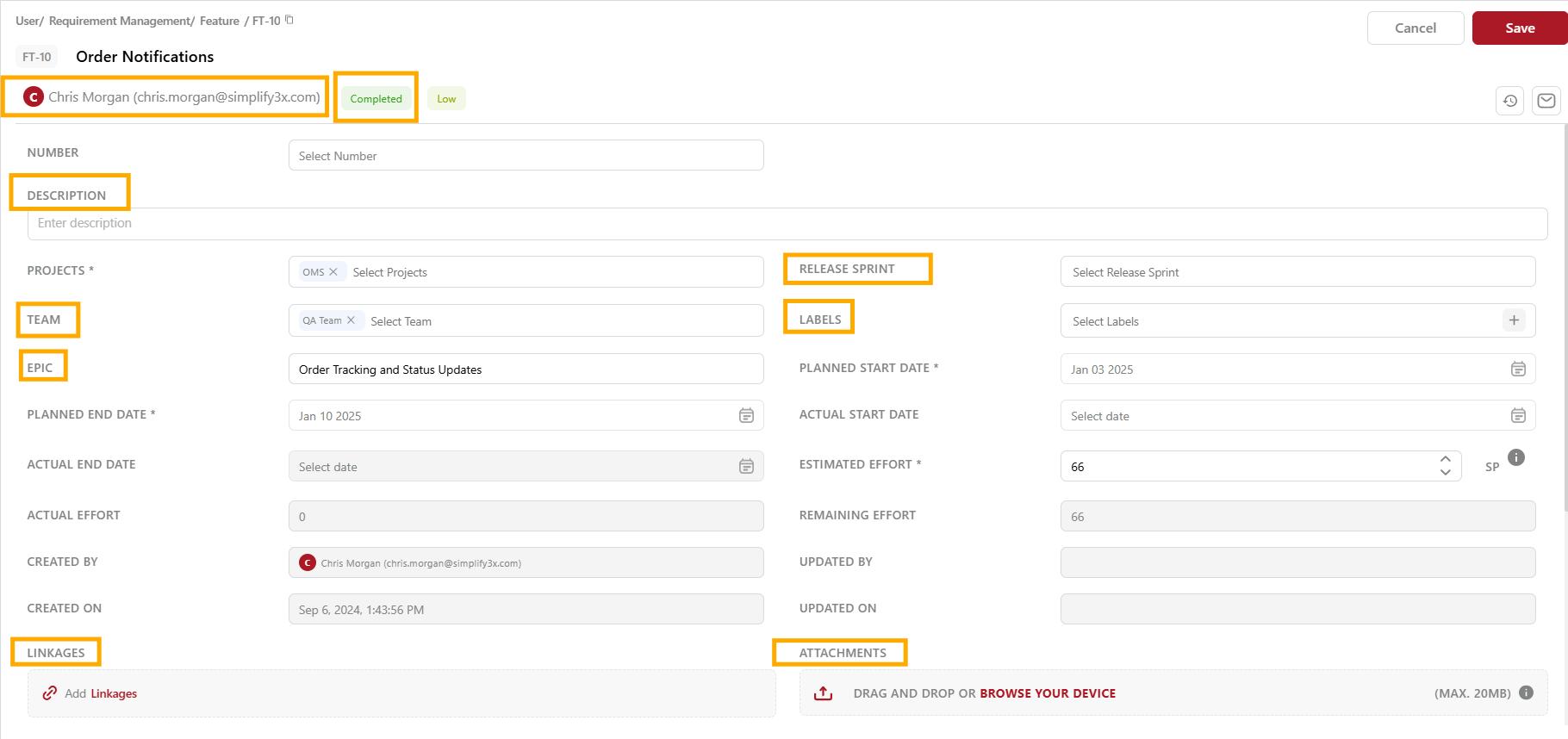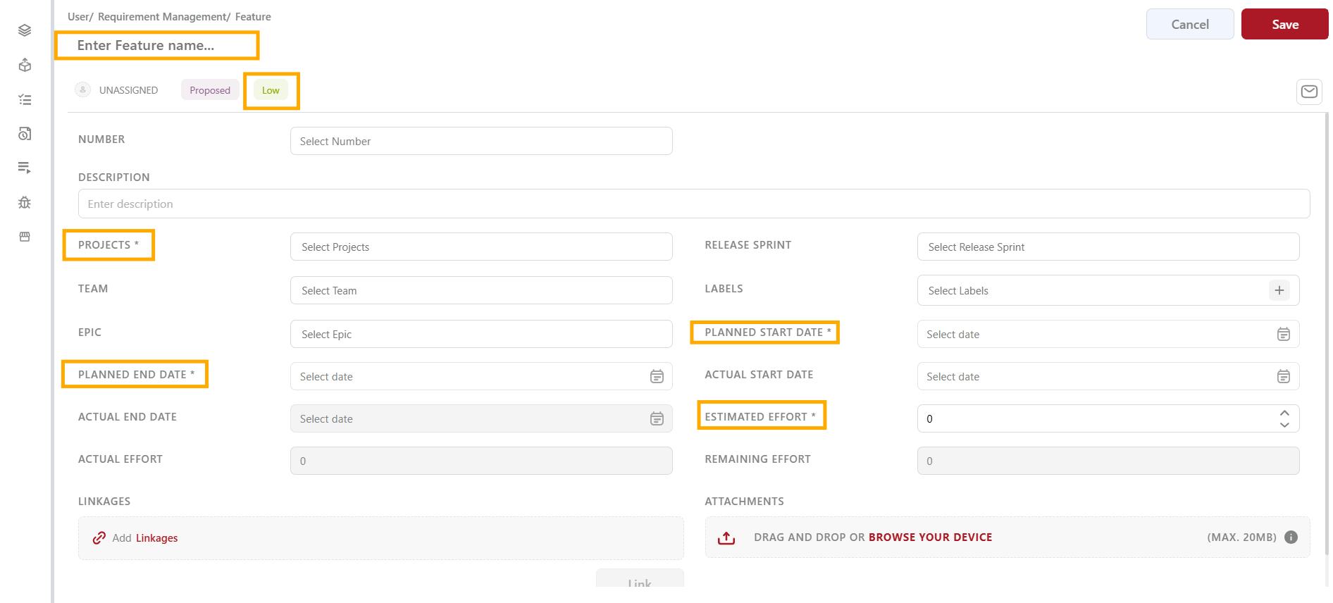 * **Attachments:** Upload any relevant documents or files related to the Feature.