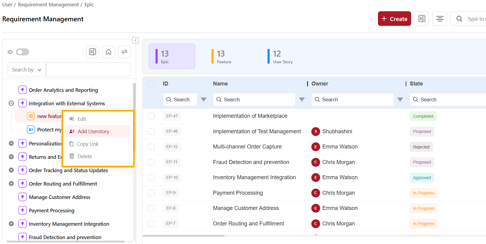 Features can also be created directly from the Tree view. Simply right-click on the desired Epic, and you'll see the "Add Feature" option, which will redirect you to the Feature creation page.
