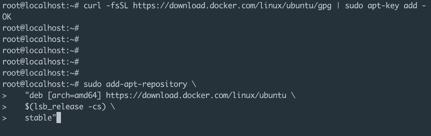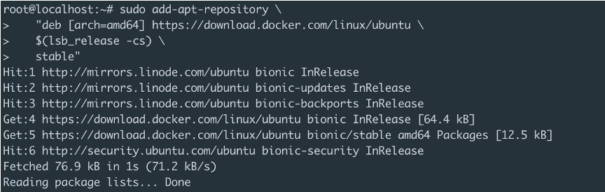 sudo add-apt-repository \ "deb [arch=amd64] https://download.docker.com/linux/ubuntu \ $(lsb_release -cs) \ stable"