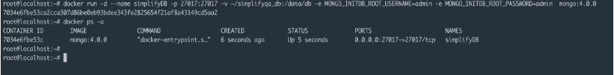 docker run -d --name simplifyDB -p 27017:27017 -v ~/simplifyqa_db:/data/db -e MONGO_INITDB_ROOT_USERNAME=<admin-username> -e MONGO_INITDB_ROOT_PASSWORD=<admin-password> mongo:4.0.0