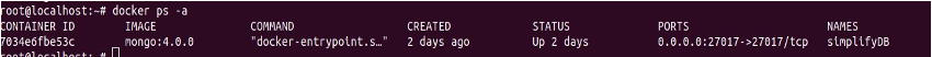 docker exec -it simplifyDB mongo -u <admin-username> -p <admin-password>