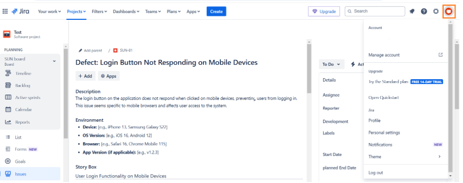 * **Click on Your Profile Icon:** On the right side of the Jira dashboard, click on your profile icon (top right corner).